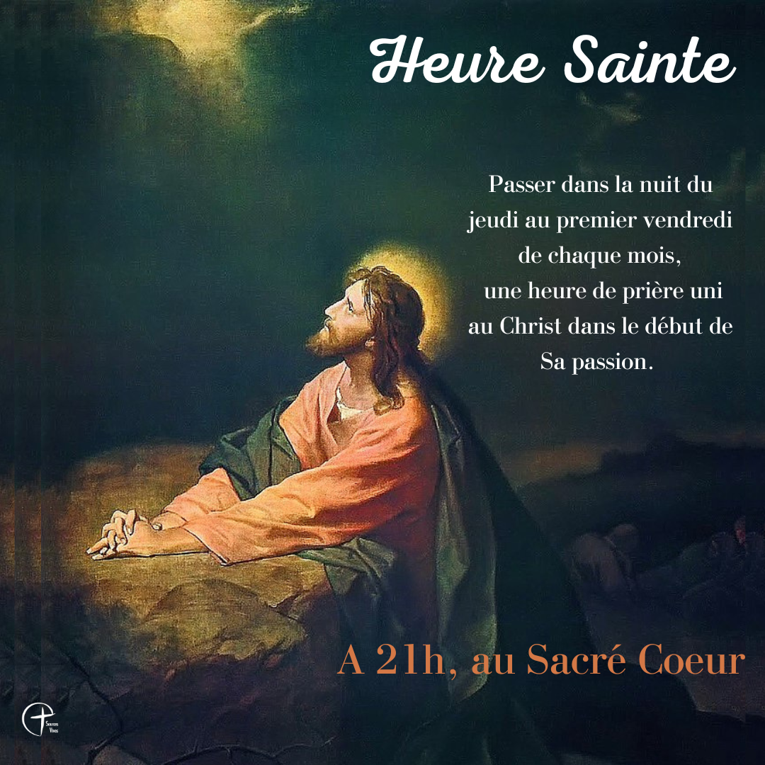 Ce jeudi 1er février à 21h au Sacré-Coeur : Heure Sainte. Pprions, pendant 1h, autour de la méditation du mystère de l’agonie du Christ, uni à Lui dans le début de sa Passion, au Jardin des Oliviers.
