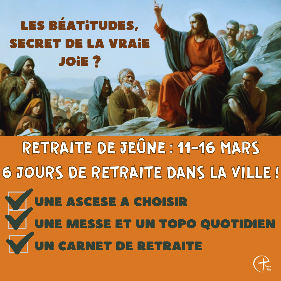 Le thème de la retraite de jeûne de cette année qui aura lieu du lundi 11 au samedi 16 Mars sera les Béatitudes, et les enseignements seront donnés par le Père Cédric Claessens. Nous nous retrouverons tous les soirs du lundi au vendredi de 20h30 à 22h à Notre-Dame de l’Annonciation. Et le samedi 16 mars, messe et rupture du jeûne autour d’un petit déjeuner festif !