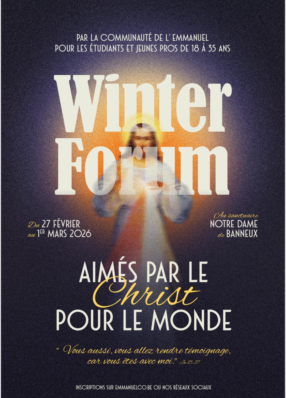 Winter Forum pour les 18-35 ans : inscriptions ouvertes ! 🔥Trouver d’autres jeunes pour vivre et avancer dans ta foi, 🔥Créer et fortifier des amitiés, 🔥Faire grandir ta relation avec Dieu et les autres 🔥 Un WE rempli de JOIE, du 27 février au 1er mars à Banneux ! Inscriptions sur https://emmanuelco.be/fr/evenement/winter-forum/