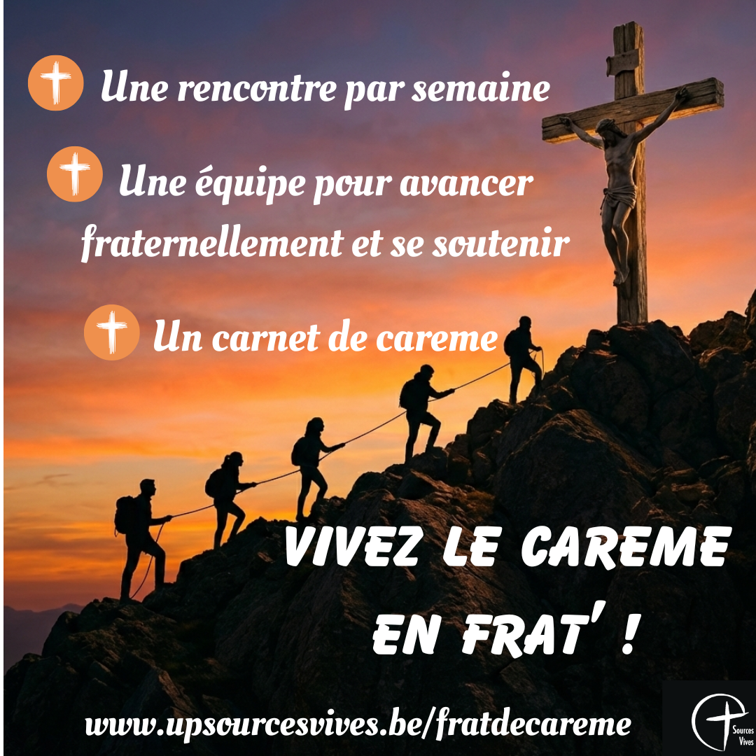 Dernière semaine pour s'inscrire et rejoindre une frat de Carême ! Inscrivez vous vite sur www.upsourcesvives.be/fratdecareme pour que nous vous ajoutions à une frat ! Pratiquement, ces équipes de 6-8 sont invitées à se réunir encore 4 fois ( 1 par semaine de Carême) à l'heure qui l'arrange, pendant 1h pour prier ensemble et partager sur leur chemin de Carême. La paroisse vous fournira également les livrets de Carême, avec une méditation par jour.