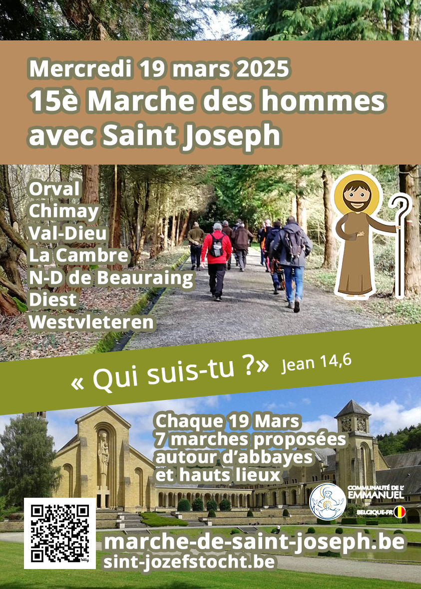 🥾 15è édition de la marche des hommes avec saint Joseph mercredi 19 mars Le thème de cette 15è édition est "Qui suis-tu?". Cette année, 7 marches, autour de 7 abbayes et hauts lieux, principalement trappistes, ont lieu en parallèle et sont ouvertes à tous les hommes. Infos et inscriptions : www.marche-de-saint-joseph.be