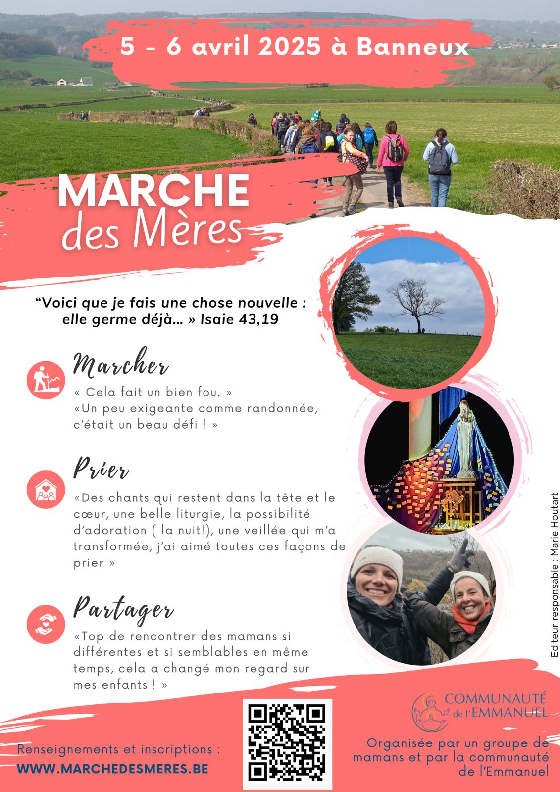 Le 5-6 avril, c'est la marche des mères ! Marche, prière, partage : venez vous ressourcer autour du thème "Voici que je fais une chose nouvelle : elle germe déjà !" (Is 43,19) Possibilité de venir pour le WE ou le samedi seulement. Infos et inscriptions : https://www.marchedesmeres.be/