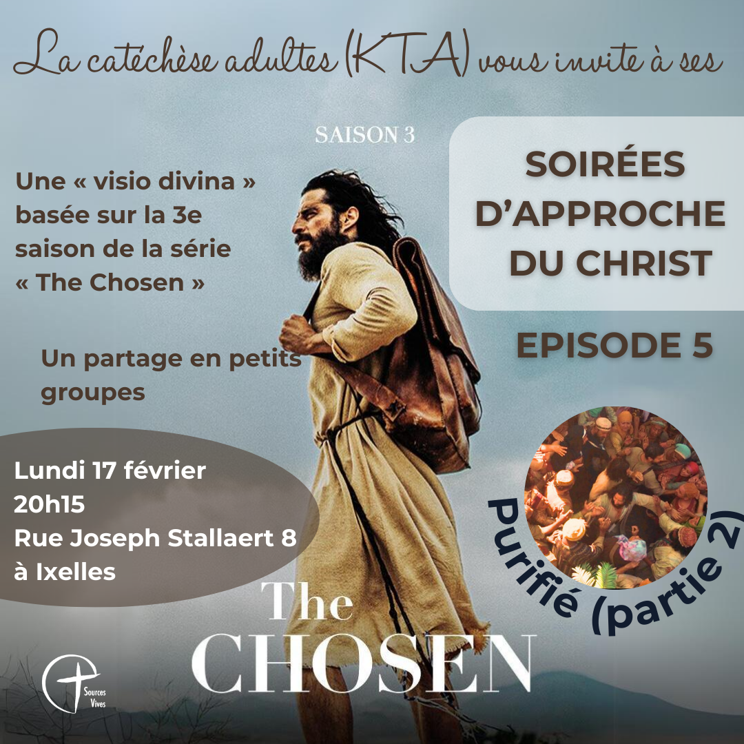 Demain, lundi, à 20h15, soirée d’approche du Christ à la Cure ( Rue Joseph Stallaert 8 à Ixelles) : visio divina du 5e épisode de la 3e saison de The Chosen! Si vous aussi, vous souhaitez venir voir ces passages des évangiles, suivi d’un temps de partage en petit groupe, n’hésitez pas à nous rejoindre !
